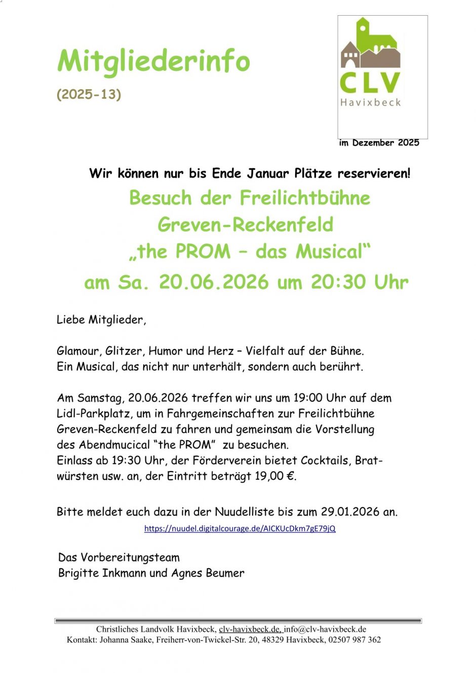 Der Anmeldeschluss war am 27.01.2026. Es haben sich 10 Mitglieder angemeldet. Wer kurz entschlossen auch noch an diesem Termin teilnemen möchte, sollte sich selbst bei der Freilichtbühne Karten besorgen und wenn möglich Sitzplätze in der Nähe von Reihe 12/13 Sitz 1-5 reservieren.